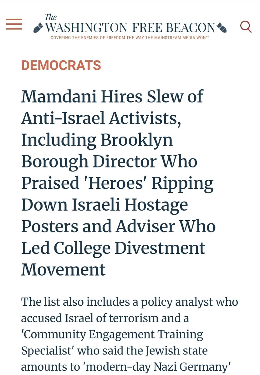 🚨 BREAKING: NYC Mayor Zohran Mamdani has filled senior and mid-level roles in his administration with activists who praised ripping down Israeli hostage posters, led anti-Israel divestment campaigns, and publicly compared Israel to Nazi Germany.