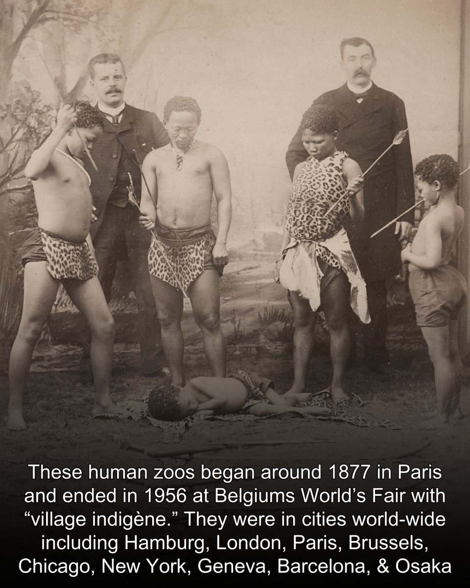 These human zoos began around 1877 in Paris and ended in 1956 at Belgiums World’s Fair with “village indigène.” They were in cities world-wide including Hamburg, London, Paris, Brussels, Chicago, New York, Geneva, Barcelona, & Osaka