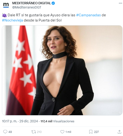 Mediterraneo Digital insultaba a Lalachus por su cuerpo al mismo tiempo que publicaba na imagen de Ayuso con IA y escotazo preguntando si les gustaría que las campanadas las diera ella.