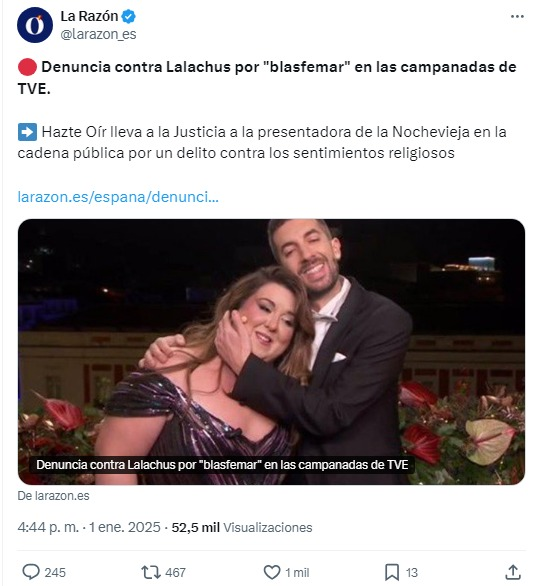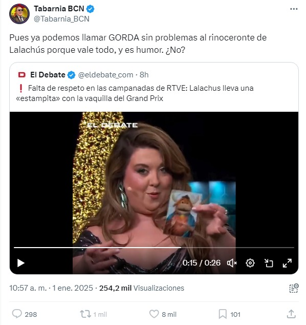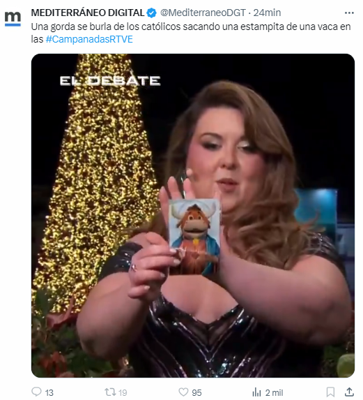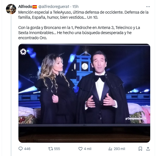 No solo cuentas anónimas llamaban gorda a Lalachus, muchas de ellas para cancelar tve y animar a ver teleayuso como Alfredo Reguera del PP, para él las campanadas de telemadrid es la última defensa de occidente.