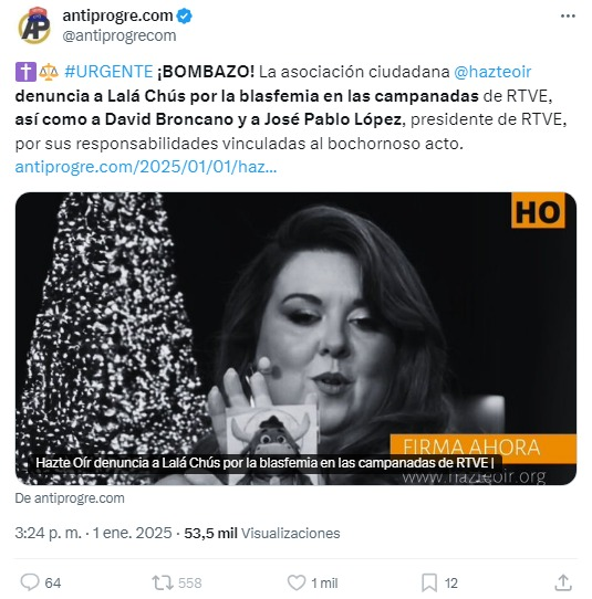 Empezamos año con una campaña contra @lalachus2 por promocionar Grand Prix con una postal. Simultáneamente han publicado el mismo fotograma Hazte Oír, Abogados Cristianos, El Debate, VOX, La Gaceta, HerQles, Antiprogre... y varios individuos haciendo TT Gorda y Cerda.