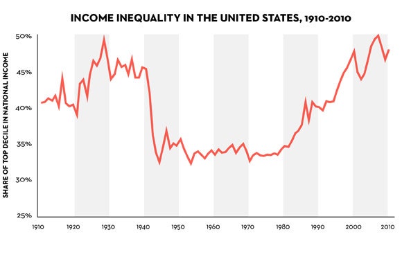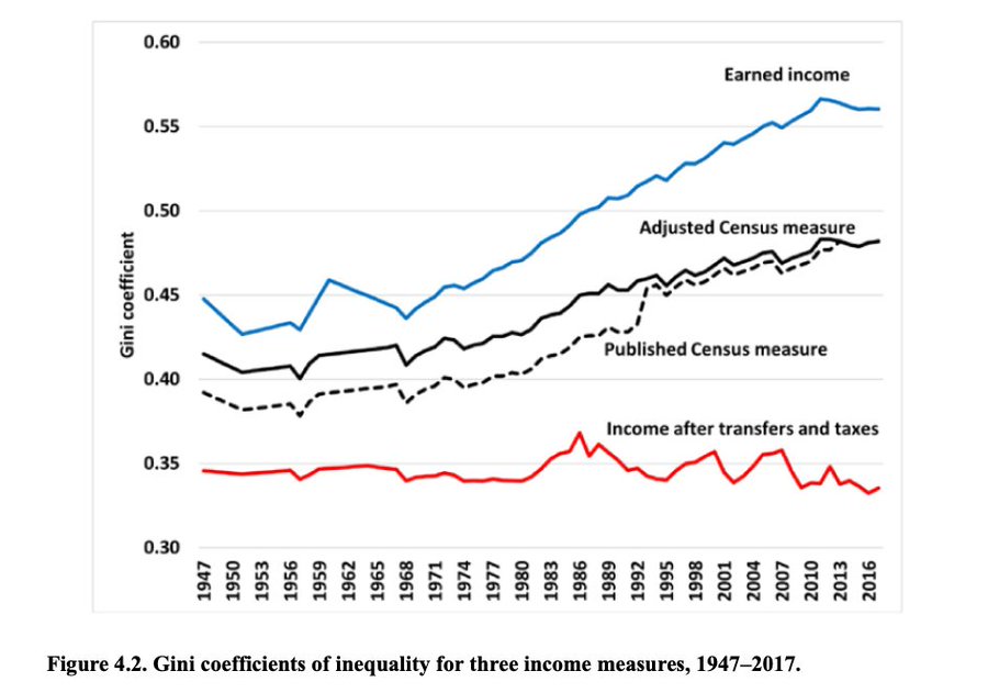 Thread on the difference between the history of pre- and post-tax and transfer income inequality in the US. The well-known story is the left earned one, with a U-shaped curve. The right is what it looks like after taxes and transfers - there's no increase post-1970.