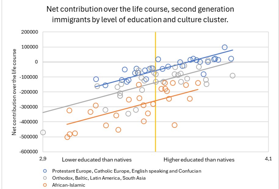 2024 Dutch version of the famous Danish "It's Complicated" graph. First generation immigrants are net fiscal negatives at all ages - entirely because of "non-western" immigrants. But at least the Netherlands benefits from... there must be something. (new study, short thread)