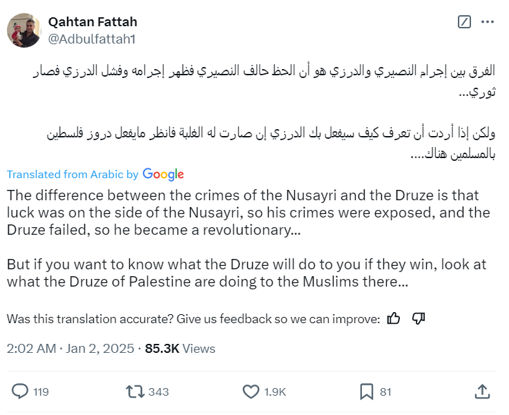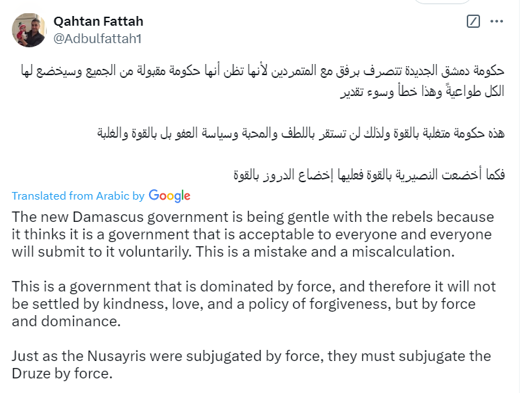 "The Druze must be subjugated by force (even when they were anti-Assad ) " says the peace loving, tree hugging anti-Assad species