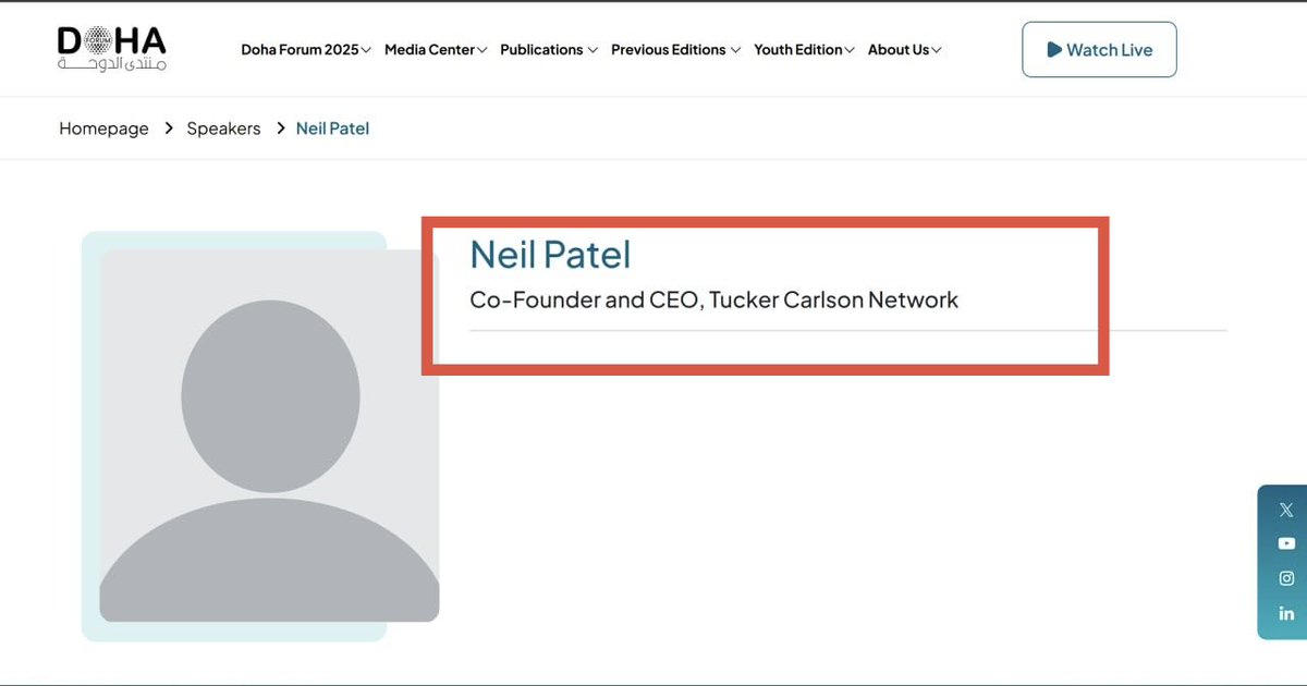 Tucker Carlson's business partner Neil Patel is scheduled to speak at the Globalist Doha Forum in Qatar from December 6-8, 2025.