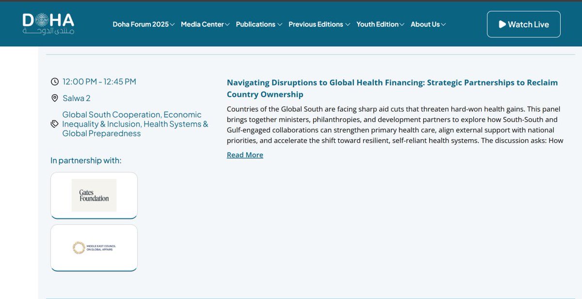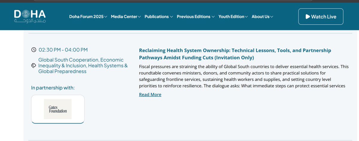 The upcoming agenda for the Doha Forum shows the Gates Foundation is leading talks and panels titled, “Navigating Disruptions to Global Health Financing: Strategic Partnerships to Reclaim Country Ownership,” and “Reclaiming Health System Ownership: Technical Lessons, Tools, and Partnership Pathways Amidst Funding Cuts” (invitation only, by the way).
