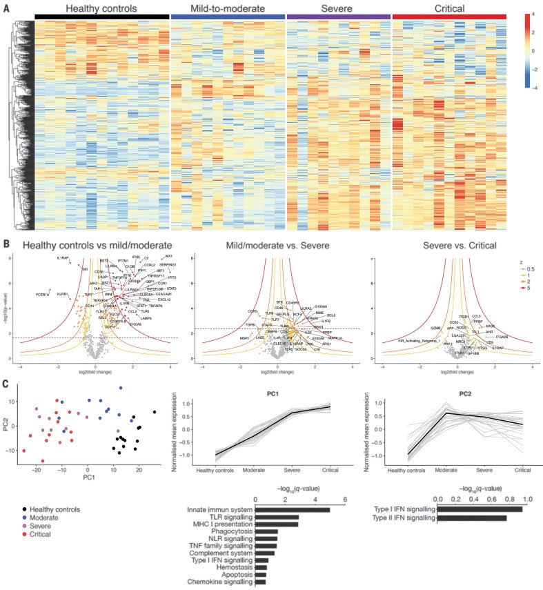 There are a bunch of papers showing this for human COVID patients. Here’s one showing unique transcriptomic signatures associated with different outcomes. There’s lots of variability between individuals & outcomes, but on the milder side not much of note.