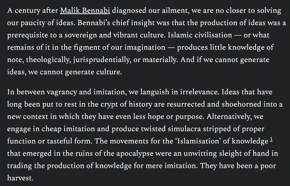Islamdom suffers from a pervasive lack of creativity. It is not an exaggeration to say that the Muslim world is among the least generative (in terms of idea production + effect on the world) among all 'civilisational groups'.