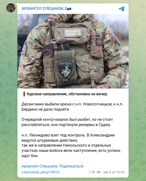 Russian military channels claim that in the Kursk direction, Russian forces reportedly recaptured Novosotnitskoye and stopped Ukrainian advances toward Berdin. Control was also reportedly established over Leonidove, with assault actions ongoing in Alexandria. Without proof, so far.