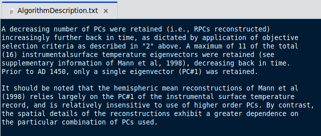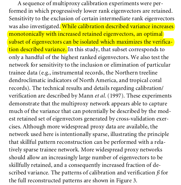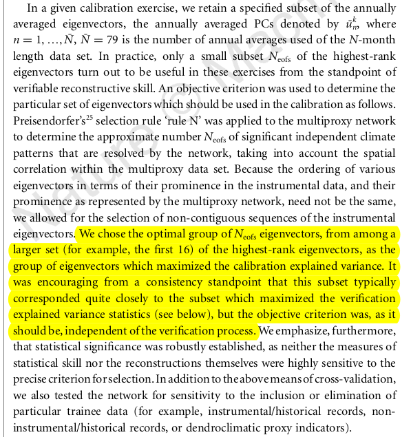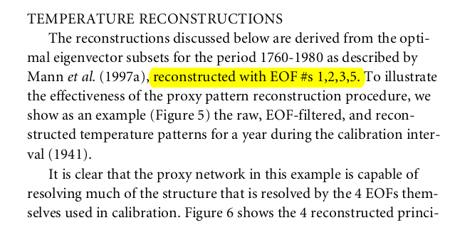 As a final note, it may or may not be possible to work out which PCs were selected for the earliest period. MB98 gives a brief description of the selection rule and refers to MBH98 for the details, but MBH98 gives a different rule. What rule they really used is anyone's guess.