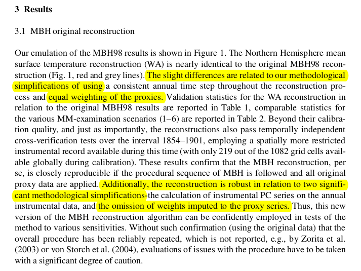 As an aside, for their emulation of MBH98, Wahl and Ammann didn't use weights either and called it a "significant methodological simplification." 🤨