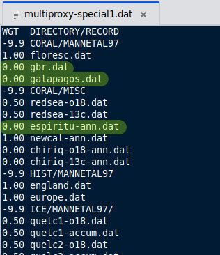 Curiously, a file in the mbh98-osborn archive assigns zero weight to the three unused coral records, but the reconstruction isn't reproducible using these weights. We'll need to reverse engineer the correct values.