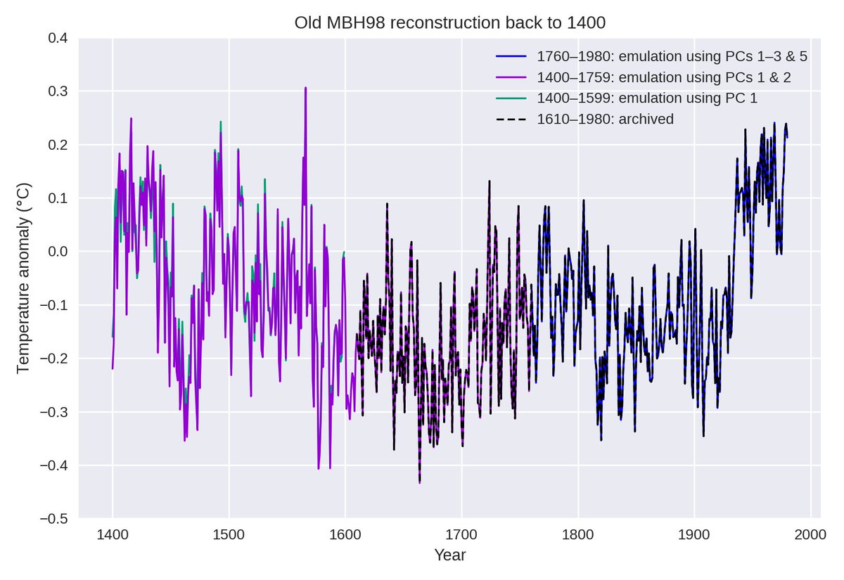 Temperature PCs 1, 2, 3 and 5 were used back to 1760, as stated in MB98 and as we have seen. For the period 1610–1759, only the first two PCs were used. With these PC selections, the emulation is exact back to 1610, which is when the archived data begins.