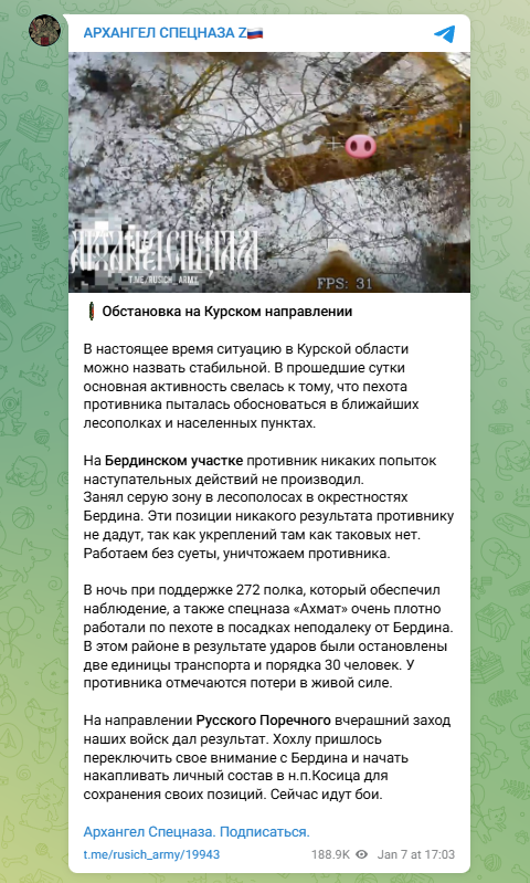 According to Russian sources, not much has changed in Kursk region. In the past day, Russian forces focused on countering Ukrainian infantry near Berdin, reportedly halting two vehicles and ~30 personnel. Ukrainian troops are regrouping near Kosytsya to hold their positions. Fighting is still ongoing.