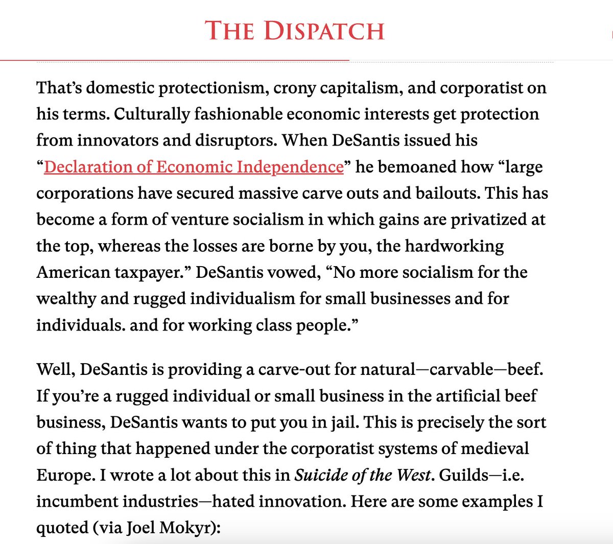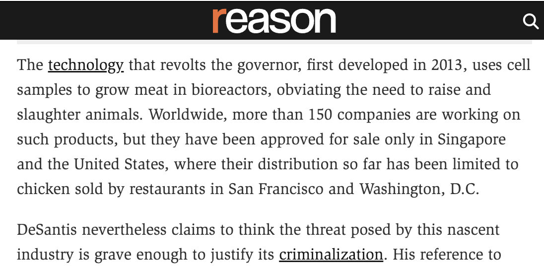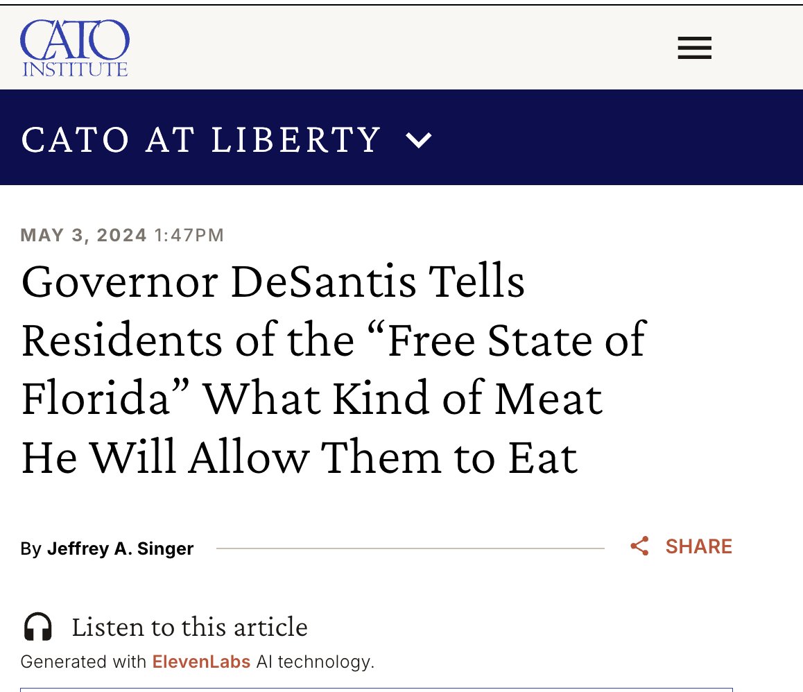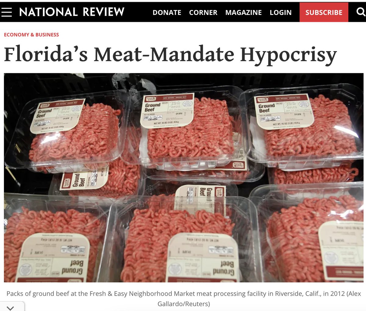 .@TheDispatch’s Nick Catoggio sums it up: “Every conservative will have the same intuition about Florida’s dumb law. If there are people willing to try lab-grown meat … and there are people willing to sell it to them, by what right does the government interfere in that transaction?” Link: 8/xtinyurl.com/4xe29c3b
