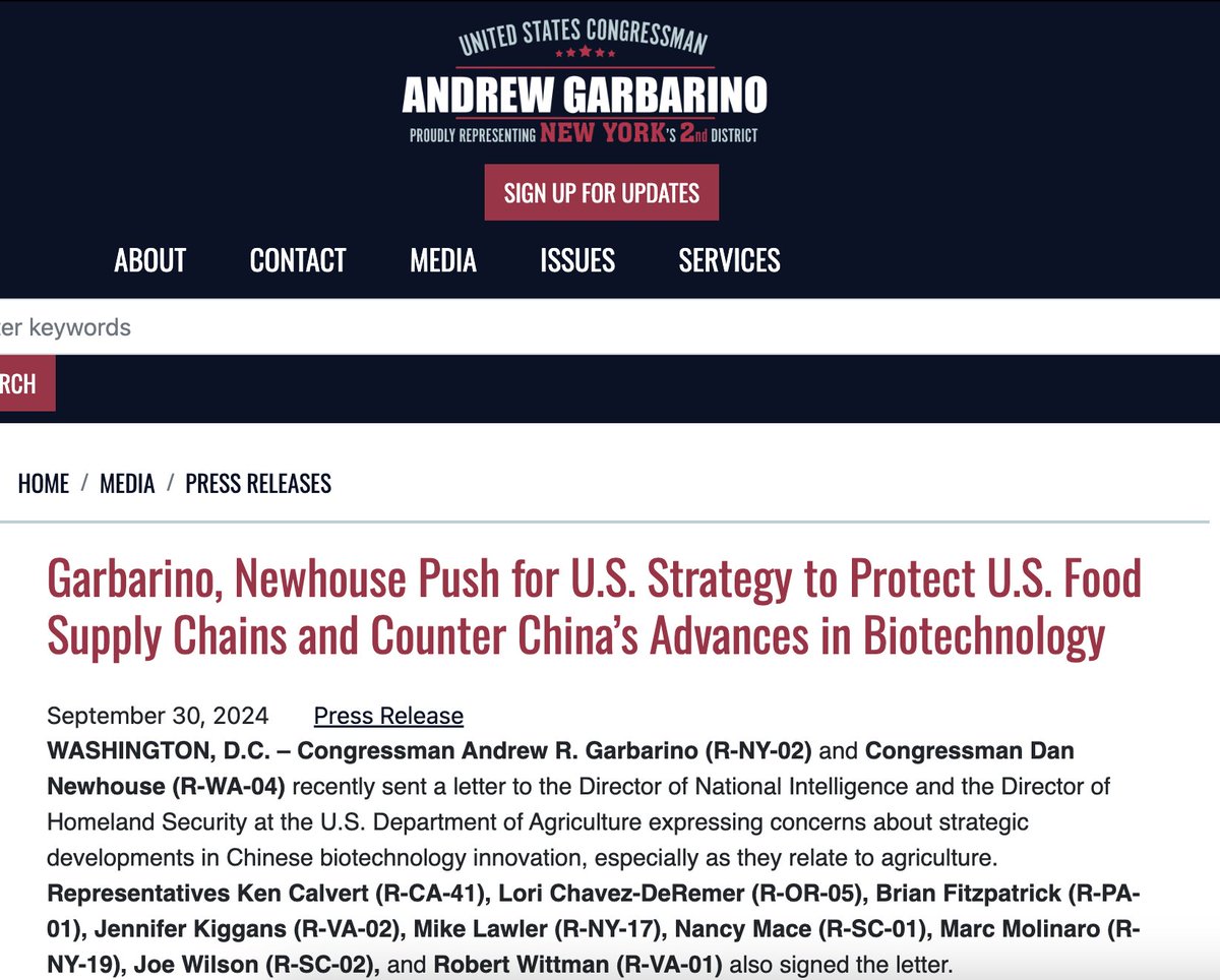 That’s the concern of Rep @GarbarinoforNY, Rep @Newhouse4Rep, and 9 other Republican members of Congress, who wrote to the directors of Homeland Security and National Intelligence stressing the importance of U.S. leadership on agricultural biotechnology, including cultivated meat, to both domestic and global food security. Link: tinyurl.com/2kfzba32 14/x