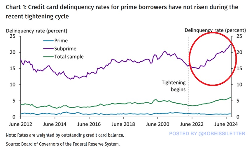 Subprime credit card delinquencies have risen 7 percentage points in just ~15 months.