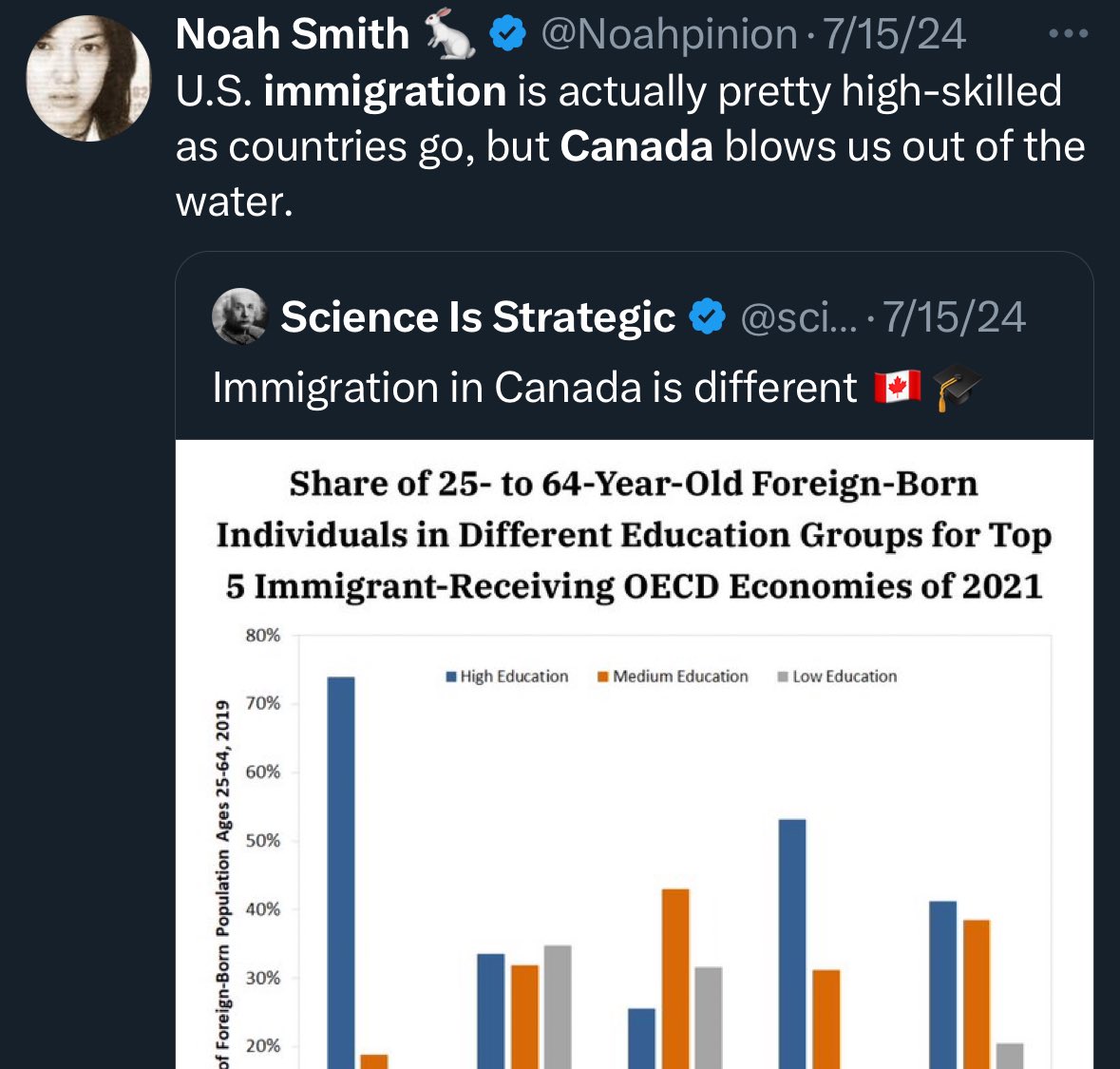 The majority of Canada’s immigration pipeline comes through their student visa program, which essentially offers a quick permanent residency pathway—a policy you've strongly advocated and claimed is the best “high-skilled” immigration policy.