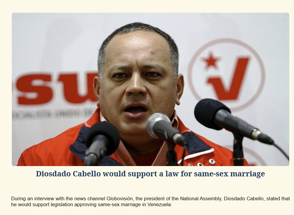 Diosdado Cabello, the Minister of the Interior, Justice and Peace, claimed that Maduro was “the candidate of sexual diversity.” (The U.S. has a $10 million reward for information leading to Cabello’s arrest for his role in trafficking drugs to America.)