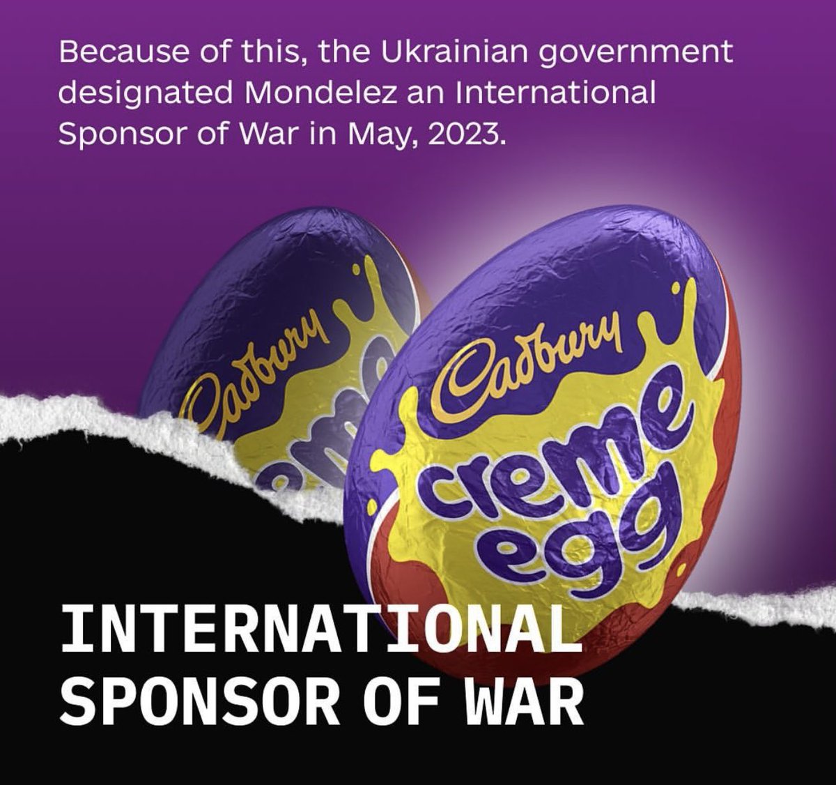 How is @cadburyuk chocolate associated with war crimes in Ukraine?