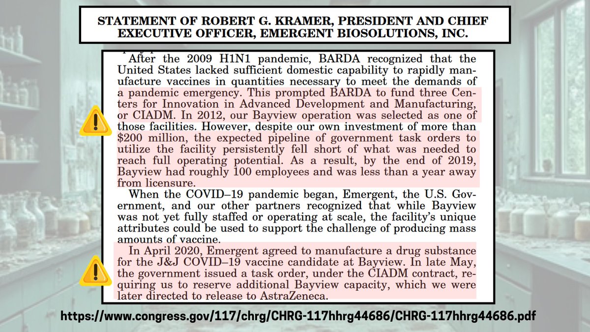 2🧵In May of 2021 the President & Exec + Chairman for Emergent Biosolutions [EB] testified before the Oversight Committee on Oversight & Reform concerning their failures in Operation Warp Speed. EB was awarded $628M and yet after 1 yr, EB hadn't produced a single viable dose!🤯