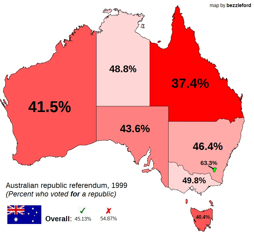 On November 6, 1999, a nationwide referendum asked Australians whether to amend the Constitution to establish a republic, replacing the Queen and Governor-General with a President appointed by a two-thirds majority of Parliament. The proposal was rejected, with 54.87% voting against it and 45.13% favoring it.