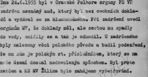 Pohraničníci ZNB zajali 24.6. 1955 u Oravské Polhory na 1 dojem zmateného, hluchoněmého primitiva bez dokladů. V báglu polský salám, chléb, holicí strojek z PLR a kudlu.