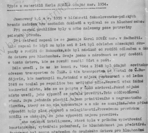 Prohlásí se Karlem Novákem, 1934, Radhošť (ČSR). Handicapem trpí od narození. 1941-42 zavlečen do Rakouska, oddělen, umístěn v úst. pro hluchoněmé ve Št. Hradci. Tam zjistí /trpí ztr. paměti/ jeho jméno, 2 roky zvláštní školy. Po válce repatriován do ČSR via Vídeň. Tovížejo 3/n