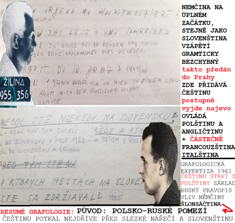 Česky. Hovoří i polsky (byl totiž Polák, pst) anglicky, část. franouzsky, italsky a ovládá latinu! 4 verze různých autonehod, kdy se šokem uzdravil. StB poctivě vše vyvrátí. Zde v roce 1972 v dokumentu StB Stará stopa při líčení poslední verze. Seznamte se - Marťan když lže.14/n