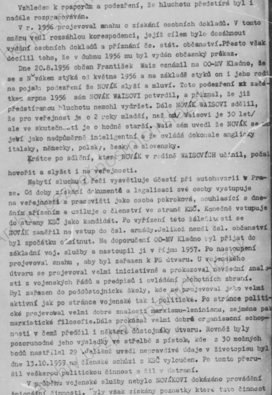 Že je špion, byl podezřelý na čáře kde kdo. Proto skončil v baráku plném policajtů s estébáckým křídlem. Špioni se obvykle za hluchoněmé nevydávají, je to nápadné. Být hluchoněmý doopravdy prakticky nemohl. Takoví neovládají bez chyb dva jazyky. Za 3 dny byl u ortolaringologa4/n