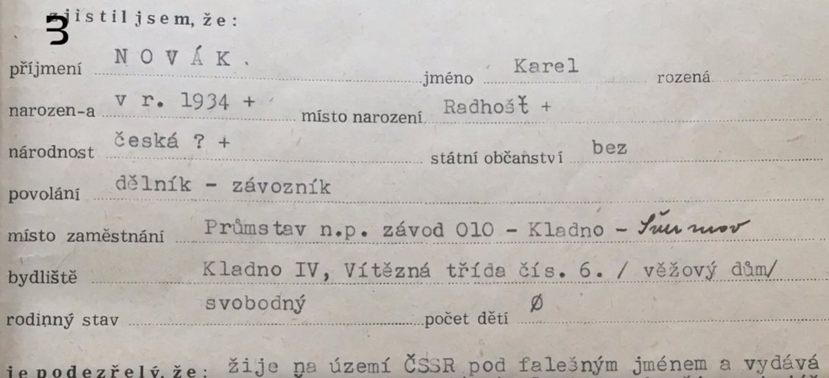 Dělalo na něm X operativců. Nic. Svazek jen na oslovování celé Evropy. Navrátilci, ústavy, média. Že umí jazyků 6 a ovládá několik oborů, vyjde najevo brzy. Teď umístěnka na Kladno. Ostuda, která si vynutí nový začátek. Aktivní rozpracování. Všemi prostředky IDENTIFIKOVAT. 12/n