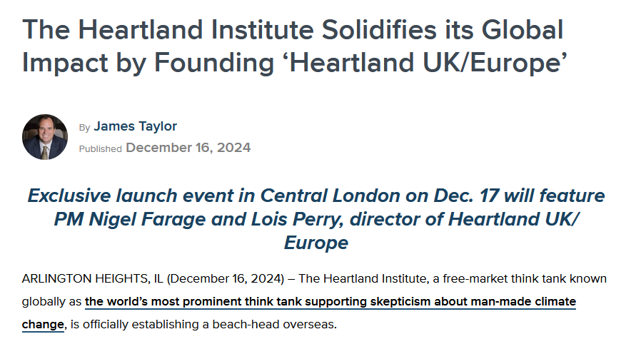 In a press release announcing its new UK-EU branch, based in London, Heartland boasted that it is “the world’s most prominent think tank supporting skepticism about man-made climate change”.