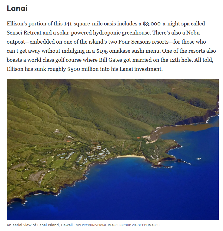 As of November 13, 2024, Ellison is the second-wealthiest man on earth according to Forbes, with an estimated net worth of $237 billion. He is also known for his ownership of 98% of Lānaʻi, the sixth-largest of the Hawaiian Islands.