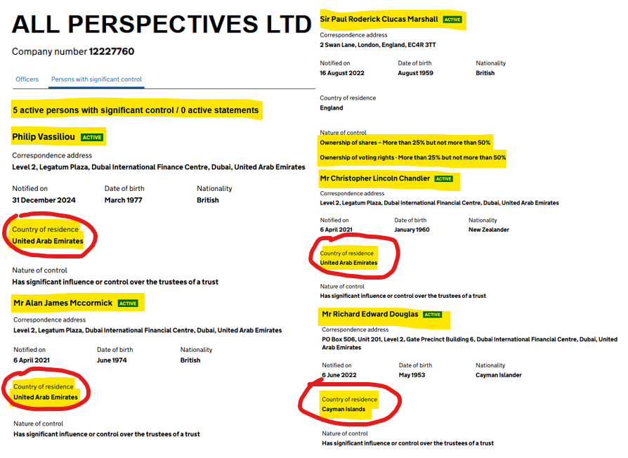 Four of the five people with significant control of the parent company of 'patriotic defender of free speech' GB "News", All Perspectives, aren't even based in the UK. Philip Vassiliou, Alan McCormick & New Zealand billionaire Chandler list their country of residence as the UAE.