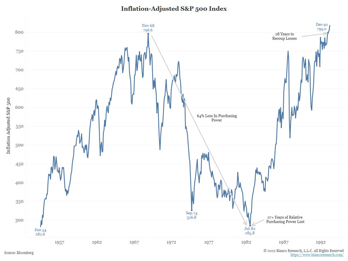 It took until 1992, 28 years later, for stocks to finally start beating cumulative inflation since 1966.