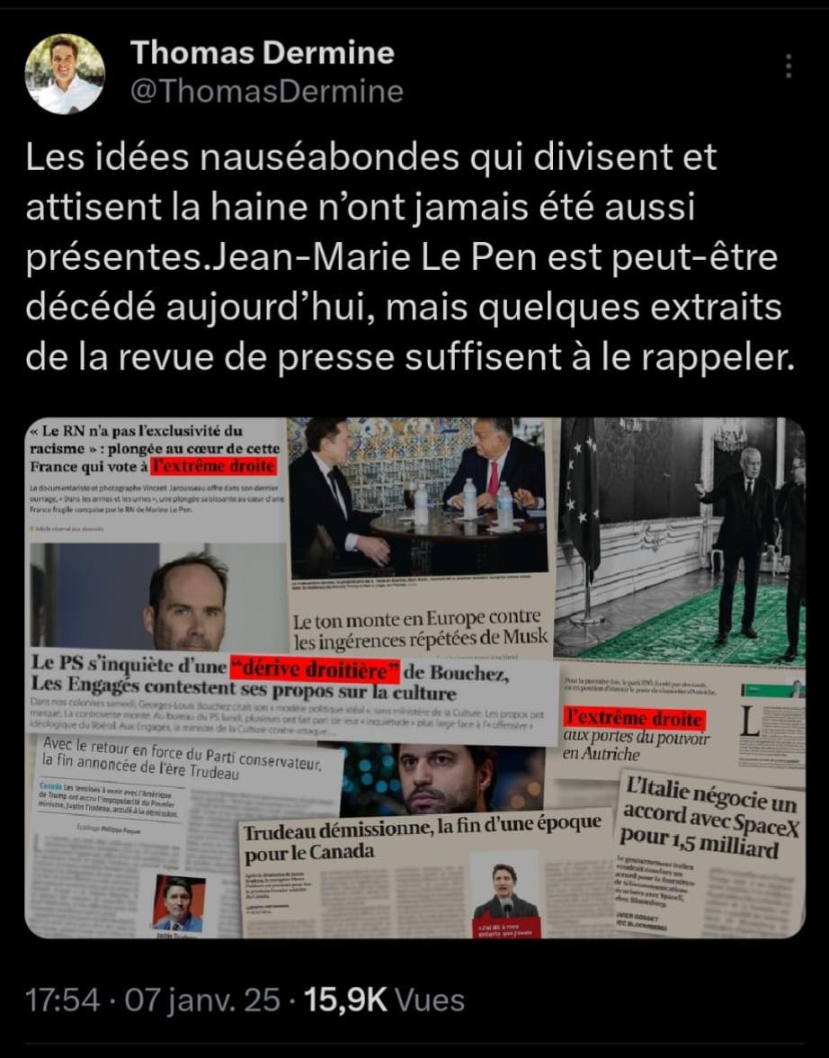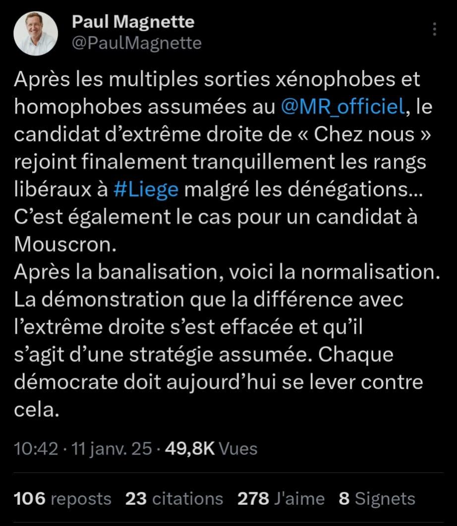 L'extrĂȘme droite doit ĂȘtre combattue mĂ©thodiquement et radicalement (Ă  l'Ă©cole, dans la presse, partout et par tous les moyens). A cĂŽtĂ© de cela, il est important de comprendre que le diable ne revient pas toujours sous les mĂȘmes habits. Qui est devenu l'un des plus grands vecteurs de l'antisĂ©mitisme aujourd'hui ? Qui dĂ©fend le communautarisme misogyne et homophobe ? Qui cultive la haine de la classe moyenne ? L'extrĂȘme-gauche. Elle doit ĂȘtre combattue pour les mĂȘme raisons, avec les mĂȘme standards et le mĂȘme zĂšle que l'extrĂȘme droite. Ceux qui ne veulent pas le faire ne sont-ils pas, en rĂ©alitĂ©, les vrais complices de l'extrĂ©misme ? Et ceux qui assimilent - Ă  mots couverts ou moins couverts - le MR Ă  Trump, au populisme, Ă  la "droite radicale", Ă  un parti d'ED ne sont-ils pas ceux qui, jetant la confusion dans la population, causent le plus de dĂ©gĂąts Ă  la dĂ©mocratie alors que nous devrions ĂȘtre tous unis face Ă  ces menaces ? Il est essentiel de renouer un dialogue et de cesser les invectives absurdes. J'invite les vrais socialistes et Ă©cologistes dĂ©mocrates, tolĂ©rants et humanistes - que je respecte - Ă  faire cesser ces excĂšs qui avilissent ce grand parti avec qui nous avons longtemps cheminĂ© au cours de notre histoire. (8/8)Image