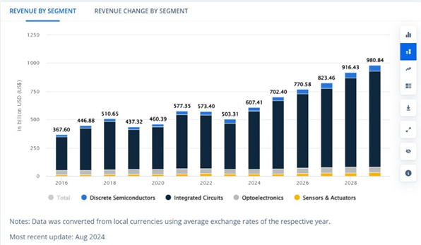 Firma analityczna Statista określa, iż przychody w skali świata ze sprzedaży półprzewodników w 2024 r. wyniosą 607,40 mld dolarów. Będą one każdego roku rosły o ok. 10 proc.
