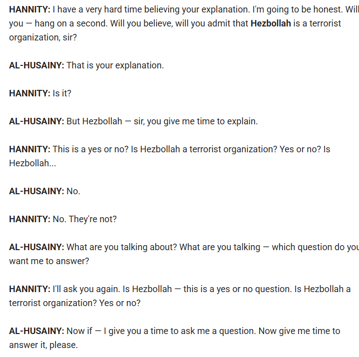 After his DNC speech, he refused to denounce Hezbollah on the Hannity show and according to a newspaper account had held up a portrait of Hezbollah leader Nasrallah