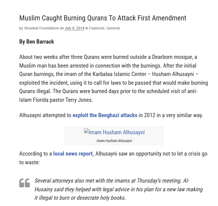 After a faked hate crime, Imam Husham Al-Husainy worked to create a bill banning Koran burning thereby imposing Sharia law on Americans