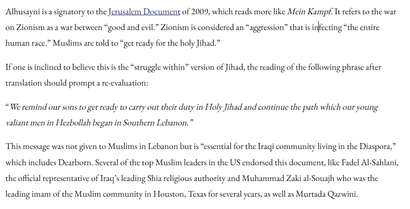 Imam Husaham al-Hussainy had signed a Jihad letter urging “our sons to get ready to carry out their duty in Holy Jihad and continue the path which our young valiant men in Hezbollah began in Southern Lebanon” and not just there, but also in America.
