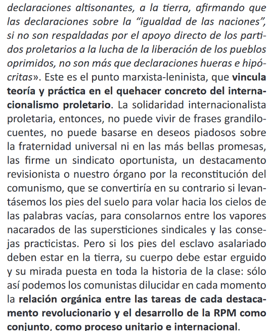 si no son respaldadas por el apoyo directo de los parti-dos proletarios a la lucha de la liberación de los pueblos oprimidos, no son más que declaraciones hueras e hipó-critas" - Stalin.