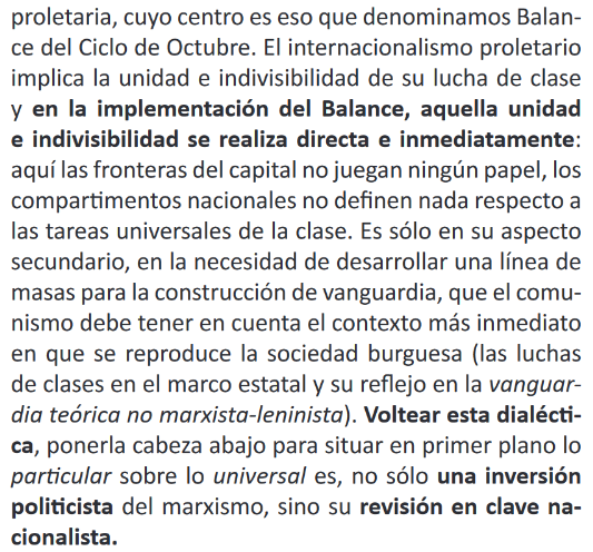 De la misma manera, es deber de los comunistas, allí donde se encuentren, señalar esta tarea revolucionaria, defender el internacionalismo proletario contra toda retórica nacionalista, muro de contención para la unión entre los proletarios de todos los países.