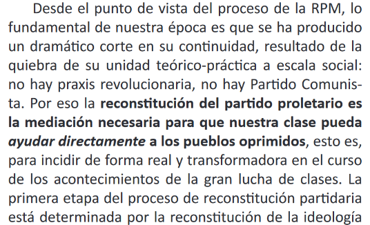 "La reconstitución del partido proletario es la mediación necesaria para que nuestra clase pueda ayudar directamente a los pueblos oprimidos, esto es, para incidir de forma real y transformadora en el curso de los acontecimientos de la gran lucha de clases".