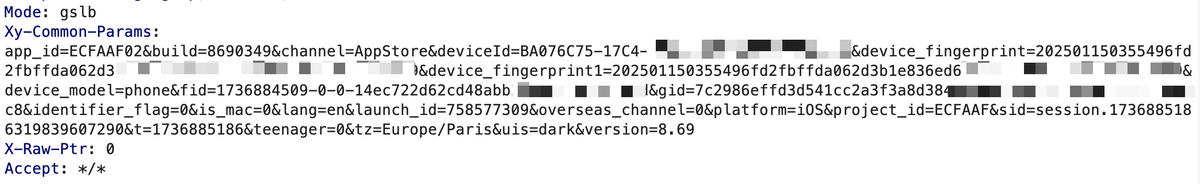 Nearly every request sent to Xiaohongshu's servers includes the Xy-Common-Params header, which contains:
