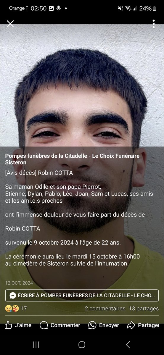 On apprend que le prisonnier violenté et égorgé en octobre 2024 par son codétenu de cellule aux Baumettes est Robin Cotta👇, 22 ans, intérimaire en installation de panneaux solaires détenu pour fausse ordonnance de codéine, qui avait pourtant supplié d'en être éloigné. #Marseille