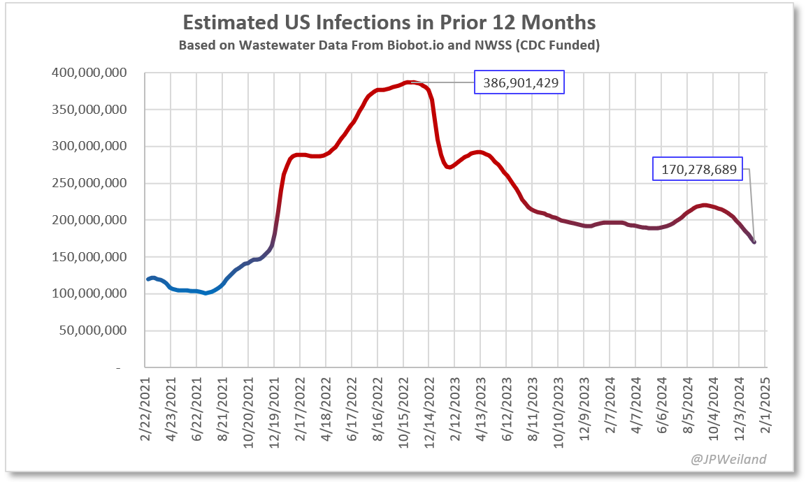Heres the rolling 12-month total infections as estimated through WW. 2022 was a heavy year with the arrival of Omicron, we're less than half that rate today. As you can see the significant 2023 winter and 2024 summer waves added a big bump near the end..