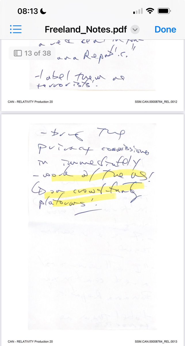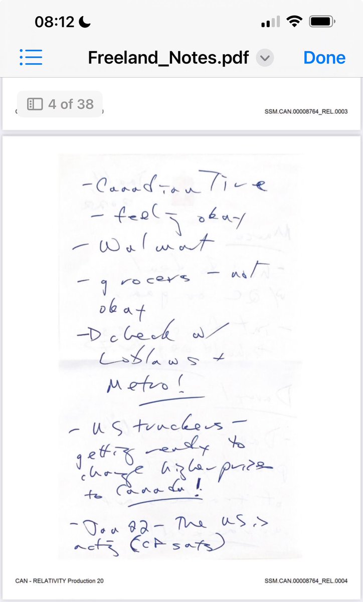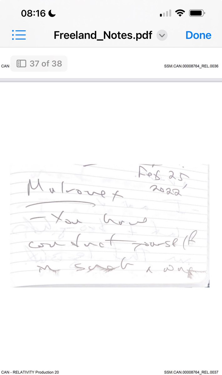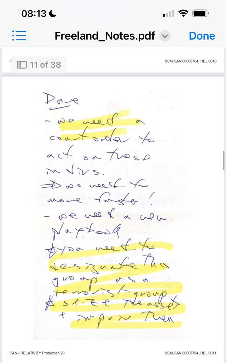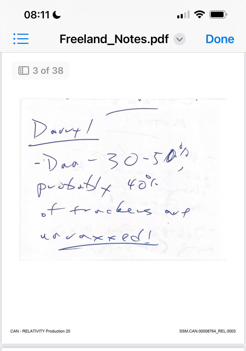 I saved a lot of evidence from the POEC but this morning I am going to share with you the (very poorly) handwritten notes from PM wannabe Chrystia Freeland. This should provide some insight as to how she really feels about everyday, hardworking Canadians who just wanted to feed their families….