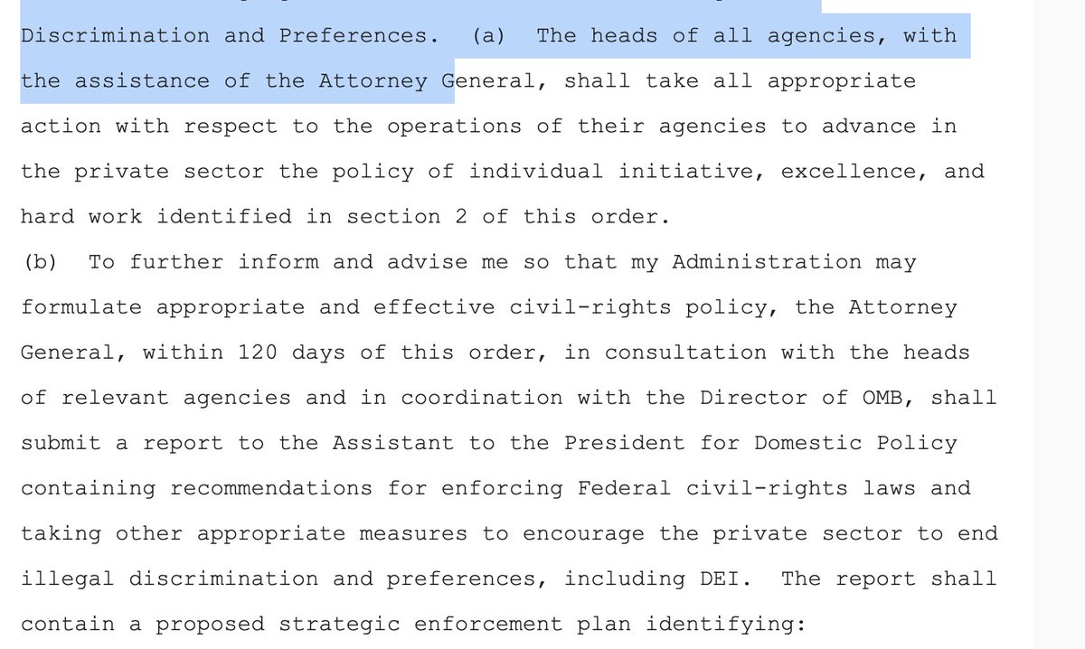 (b) To further inform and advise me so that my Administration may formulate appropriate and effective civil-rights policy, the Attorney General, within 120 days of this order, in consultation with the heads of relevant agencies and in coordination with the Director of OMB, shall submit a report to the Assistant to the President for Domestic Policy containing recommendations for enforcing Federal civil-rights laws and taking other appropriate measures to encourage the private sector to end illegal discrimination and preferences, including DEI. The report shall contain a proposed strategic enforcement plan identifying: