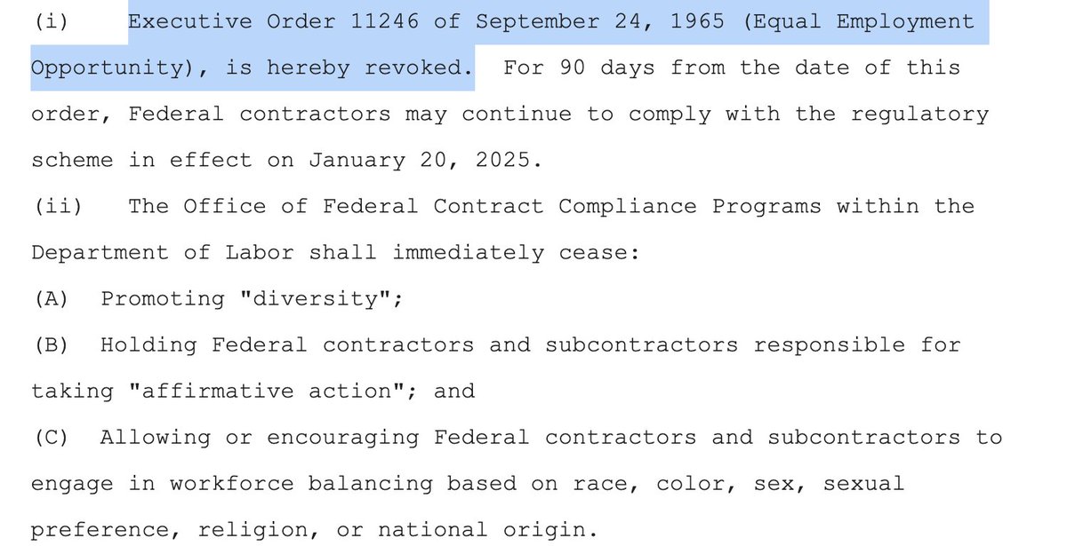 (i) Executive Order 11246 of September 24, 1965 (Equal Employment Opportunity), is hereby revoked. For 90 days from the date of this order, Federal contractors may continue to comply with the regulatory scheme in effect on January 20, 2025.