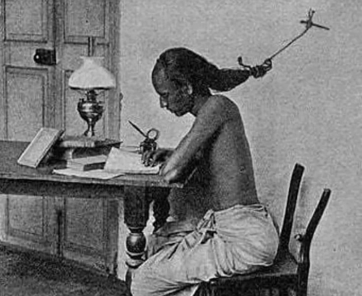 1. An Indian student studying at the University of Madras in Tamil Nadu, 1905. While studying late at night, students use to tie their hairs to a nail in the wall to prevent themselves from falling asleep